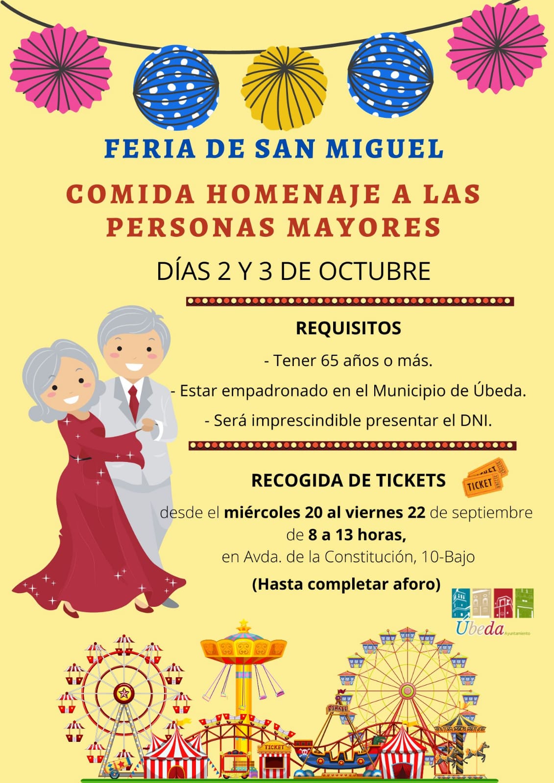 Desde el Ayuntamiento de Úbeda, concretamente desde la Concejalía de Mayores y Participación Ciudadana, se informa a la ciudadanía que con motivo de la celebración del Día Internacional de las Personas Mayores, se organizará la tradicional comida en homenaje a este colectivo de la ciudad los días 2 y 3 de octubre, en el espacio Multiservicios del Recinto Ferial.