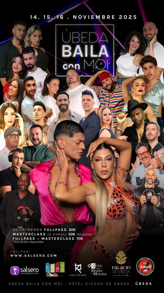 Entre los protagonistas se encuentran ‘Karen y Ricardo’, campeones mundiales y referentes del baile latino, junto a un amplio grupo de artistas invitados que llenarán de ritmo, técnica y pasión las pistas de baile ubetenses. El evento cuenta con la colaboración del Palacio de Úbeda, el Hotel Ciudad de Úbeda, Pub Kangaroo Moi, la plataforma Yosoysalsero.com y el Ayuntamiento de Úbeda, a través del Área de Festejos.